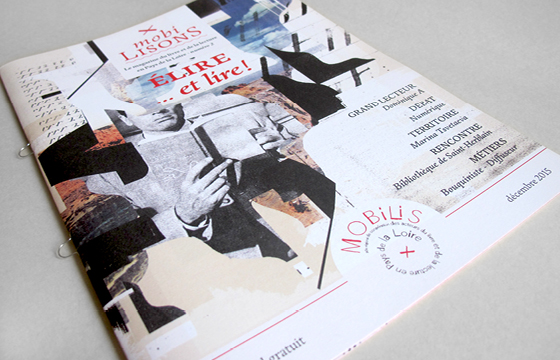 Mise en page du numéro 2 du magazine MobiLISONS, semestriel publié par l’association Mobilis (Pôle régional des acteurs du livre et de la lecture en Pays de Loire), illustrations de Boris Jakobek, coordination artistique Marie Rébulard. L’ensemble est composé en LCT Sbire par l’Atelier La Casse